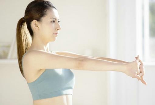 2、双手保持交叠,用力向前伸,保持10秒。每天做5次