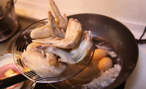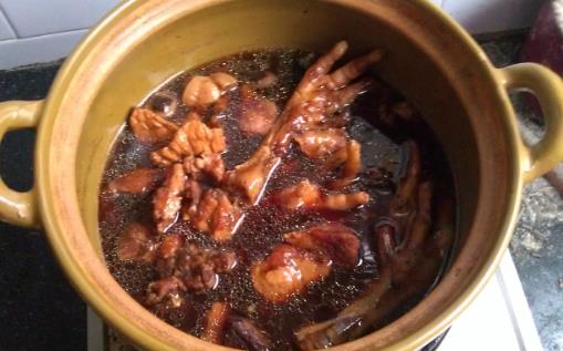 3、另起锅放色拉油烧至四成热,投入D料小火浸炸3分钟,烹入料酒,放入处理好的A料,一起放入红曲米水中,大火烧开,改用小火熬2.5小时,加入C料小火熬25分钟即成。